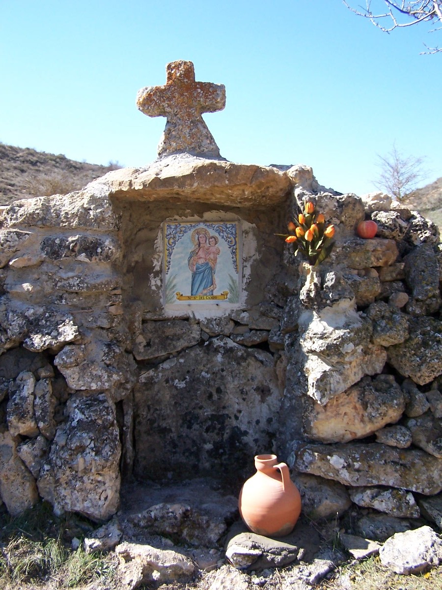 Satisface también agradecer la tarea y aportación colectiva de quienes se han esforzado en el adorno de nuevos y entrañables rincones en los que resucitar antañonas leyendas, como la de la Virgen del Campo, y han levantado un pequeño oratorio entre las piedras, que reproducimos en la fotografía. Una imagen de la Virgen, en cerámica de Talavera de la Reina, con su cántaro, hermosea un trecho del camino hasta la Fuente y recupera memoria y devociones lejanas. Cuentan los que estuvieron en el pueblo en la pasada Semana Santa, que una señora piadosa aportó la placa de la Virgen, que tampoco es que al artista le haya salido como las que pintó Murillo, si bien para el campo sirve y además al final se le cogerá cariño. A la generosa donación se respondió en hacendera, trabajando los disponibles en el encaje de piedras y traza del camino con lo que se limpió la ruta hasta el hueco en el que se ubica la imagen de la Virgen, con el cántaro de la tradición, historia que en otra ocasión desarrollaremos y de la que quedará noticia en el propio monumento.